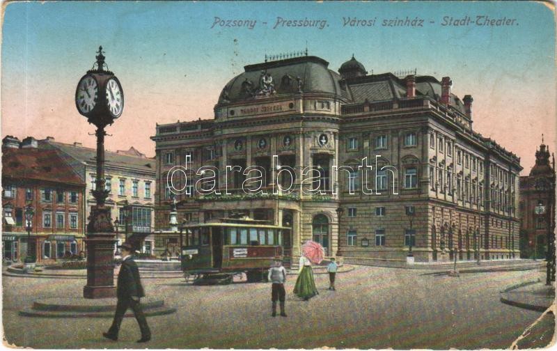 Pozsony, Pressburg, Bratislava; Városi színház, köztéri óra, villamos,... https://www.darabanth.com/de/35-Gross-Auktion/35.1/Ansichtskarten/Slowakei~14668/Pozsony-Pressburg-Bratislava-Varosi-szinhaz-kozteri-ora-villamos-uzletek-theatre-clo~II2355169