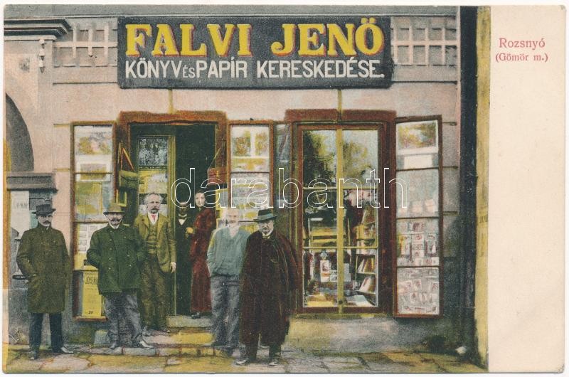 Rozsnyó, Roznava (Gömör); Falvi Jenő könyv- és papírkereskedése, üzlet... https://www.darabanth.com/de/35-Gross-Auktion/35.1/Ansichtskarten/Slowakei~14668/Rozsnyo-Roznava-Gomor-Falvi-Jeno-konyv-es-papirkereskedese-uzlet-kirakata-shop-fron~II2366130