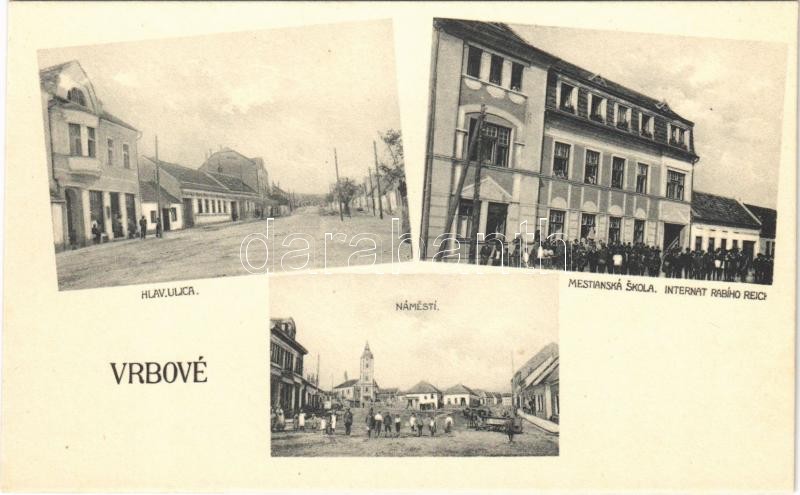 Verbó, Vrbové; Hlav. ulica, Mestianska Skola, Internat Rabího Reieh, Namesti / Fő utca, helyi iskola, Reieh rabbi által alapított internátus, tér. Oszlánszky Viktor kiadása / main street, local school, boarding school founded by rabbi Reieh