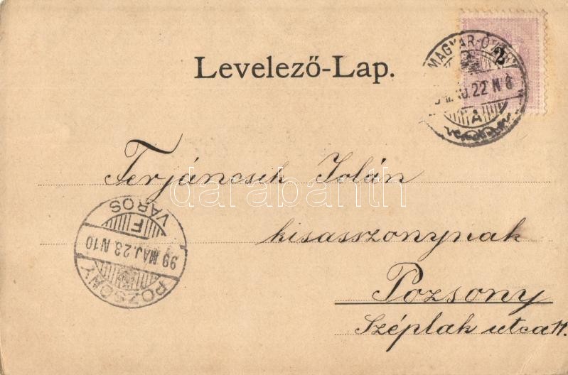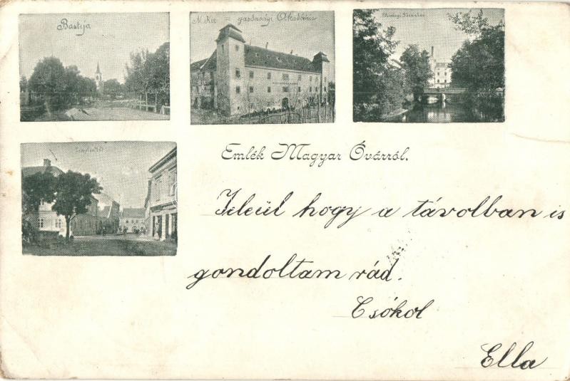 Beschreibung: 1899 Mosonmagyaróvár, Magyaróvár; Bástya, M. kir. Gazdasági Akadémia, Főhercegi gőzmalom, Templom tér (EK)