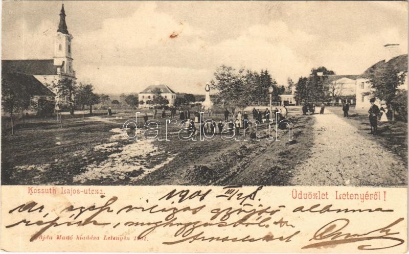 Beschreibung: 1901 Letenye, Kossuth Lajos utca, templom, szobor. Vajda Manó kiadása (Rb)