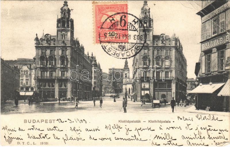 1903 Budapest V. Klotild paloták, Varga üzlete, háttérben a felállvány... https://www.darabanth.com/de/35-Gross-Auktion/35.1/Ansichtskarten/Ungarn~14666/1903-Budapest-V-Klotild-palotak-Varga-uzlete-hatterben-a-felallvanyozott-Erzsebet-hid-ep~II2366456