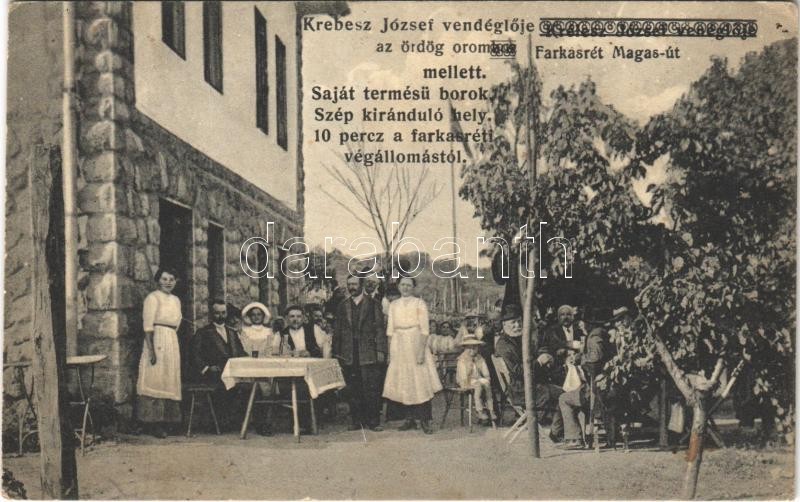 Beschreibung: Budapest XII. Farkasrét, Magasút (Magas-út), Krebesz József vendéglője az ördög orom mellett. Saját termésű borok, szép kirándulóhely, kert (EK)