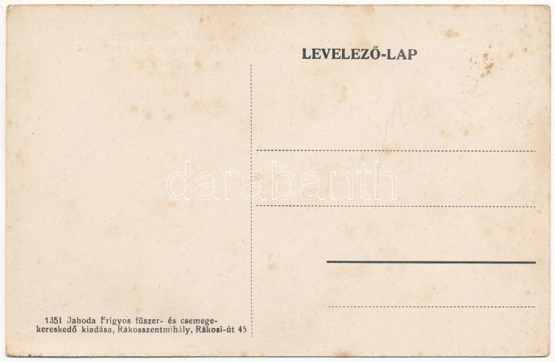 Beschreibung: Budapest XVI. Rákosszentmihály, Jahoda Frigyes fűszer és csemege üzlete és saját kiadása. Rákosi út 45.
