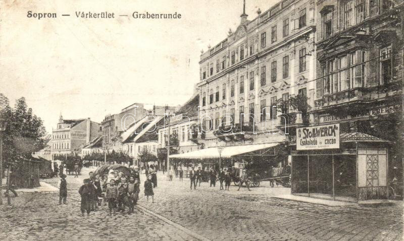 Beschreibung: Sopron, Várkerület, Stollwerck csokoládé reklámja, utcakép, Breuer Testvérek üzlete (Rb)
