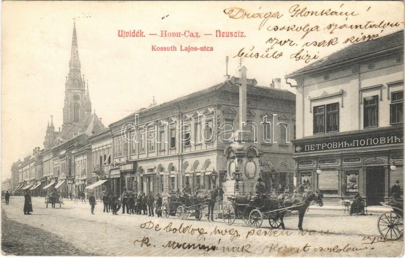1908 Újvidék, Novi Sad; Kossuth Lajos utca, lovaskocsik, templom, Kereszt szobor, Petrovic és Popovic üzlete. Klein Vilmos kiadása / street, shop, church, statue