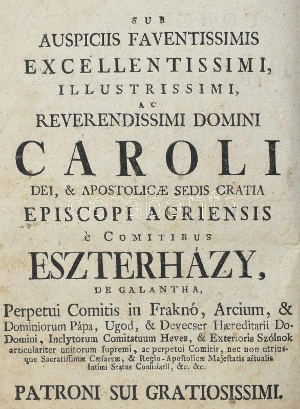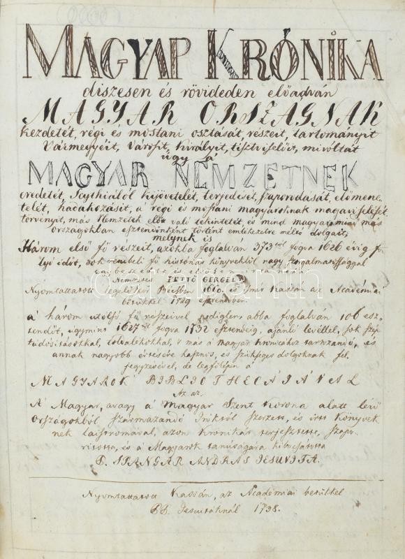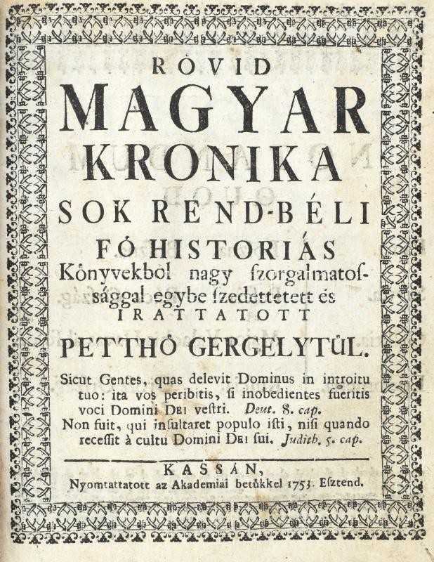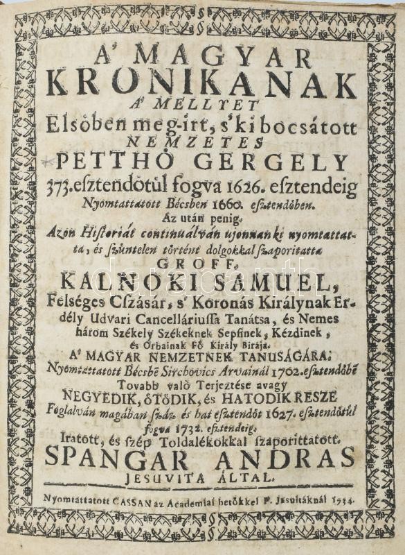 Kolligátum: Csukás, Benjamin: Conclusiones ex universo jure Hungarico publicae disputationi expositae, quas... Collegio Agriensi Foglariano anno 1768. die.. mensis Augusti ...publice propugnandas suscepit... Volffgangus Komáromy ...juris patrii auditor emeritus, praeside... - - ... Agriae (1768), typis Scholae Episcopalis. [6] lev hozzákötve: Spangár András: Magyar Kronika... Kinek-is Három első Fő Részeit... elsőben irta néhai Nemzetes Pettő Gergely... A' Három utólsó Fő Részeivel... De leg-főképpen a' Magyarok Bibliotekajával... azon Kronikát terjesztette, szaporitotta, és a' Magyarok tanúságára ki-bocsátotta - -. Kassán, 1738, Academiai bötűkkel. [2], 322 [helyesen 312]p. Hozzákötve: Spangár András: A' Magyar Kronikanak a' mellyet Elsőben meg-irt, s kibocsátott nemzetes Petthő Gergely 373. esztendőtűl fogva 1626. esztendeig [...] Azon Historiát continuálván ujonnan ki nyomtattatta, és szüntelen történt dolgokkal szaporitatta Groff Kálnoki Samuel [...] Tovább való Terjesztése avagy Negyedik, Ötödik, és Hatodik Resze. Foglalván magában száz és hat esztendőt 1627. esztendőtűl fogva 1732. esztendeig. Iratott, és szép Toldalékokkal szaporittatott. - - jesuvita által. Cassan, 1734. Academiai betőkkel. [2], 209p. Hozzákötve: [Pethő] Petthő Gergely: Rövid Magyar Kronika sok rendbéli fő historiás Könyvekből nagy szorgalmatossággal egybe szedettetett és irattatott Petthő Gergelytűl. Cassán [Kassa], 1753, Az Akadémiai Bötűkkel 169p + VI. A második műből 5 lap, a harmadikból 7 lap, a negyedikből 9 lap korabeli kézírással pótolt. Korabeli kopottas félbőr kötésben.