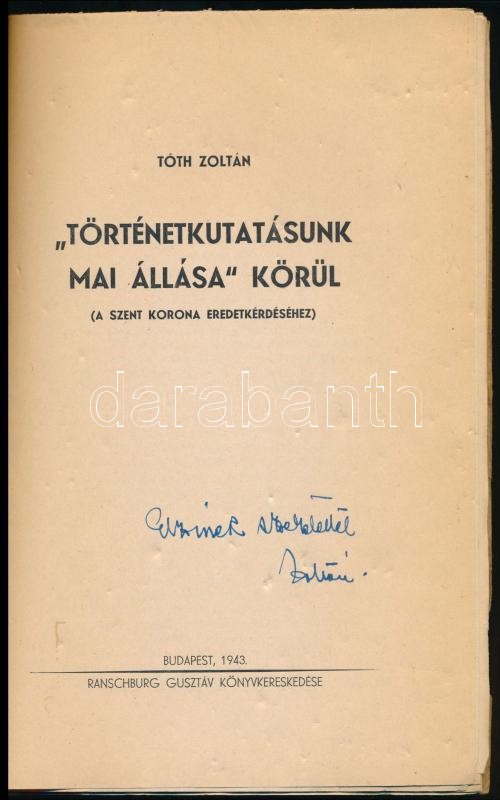 Tóth Zoltán: "Történetkutatásunk mai állása" körül. (A Szent Korona eredetkérdéséhez.) Bp., 1943, Ranschburg Gusztáv, 36 p. Kiadói papírkötés. A szerző, Tóth Zoltán (1911-1956) történész, 1956-os forradalom mártírja által dedikált. Ritka!