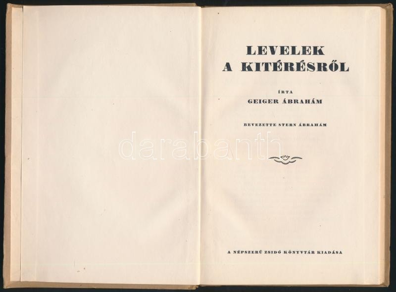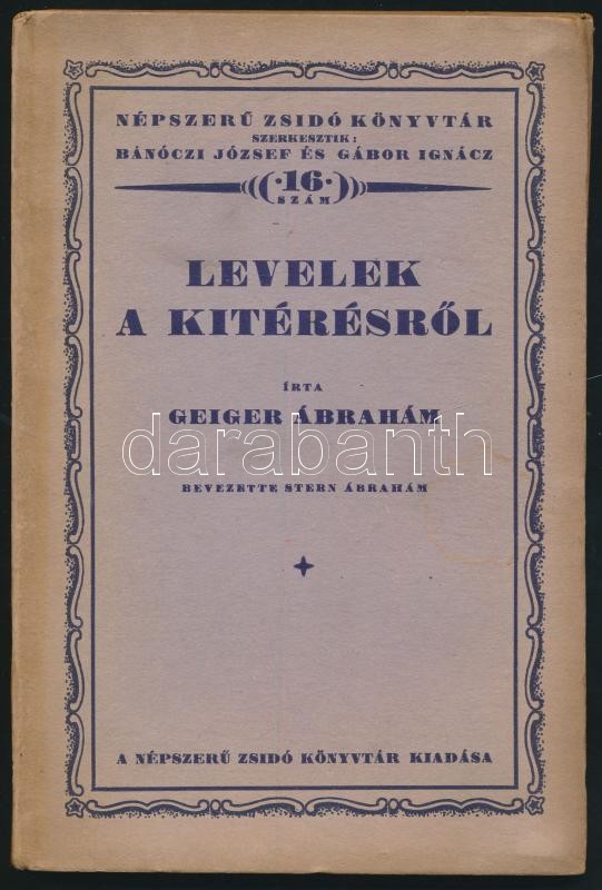 [Alexandriai Philón (Philo Alexandrinus/Filon Alexandrinos)] Geiger Ábrahám: Levelek a kitérésről. Írta [közrem.]: - - . Stern Ábrahám bevezetőjével. Népszerű Zsidó Könyvtár 16. Szerk.: Bánóczi József és Gábor Ignác. [Bp.,1925,] Népszerű Zsidó Könyvtár,[Globus-ny.], 53+2 p. Kiadói kartonált papírkötésben, a borítón kis folttal. Ritka!