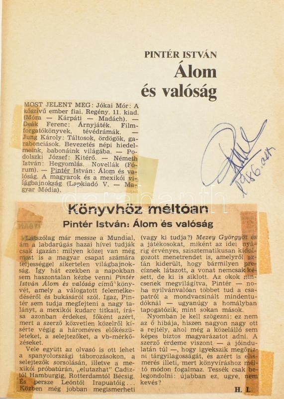 Pintér István: Álom és valóság. Bp., é.n., Lapkiadó Vállalat. Puskás Ferenc, az Aranycsapat kapitánya által aláírt példány. Kiadói papír kötésben, újságcikk ragasztásokkal.