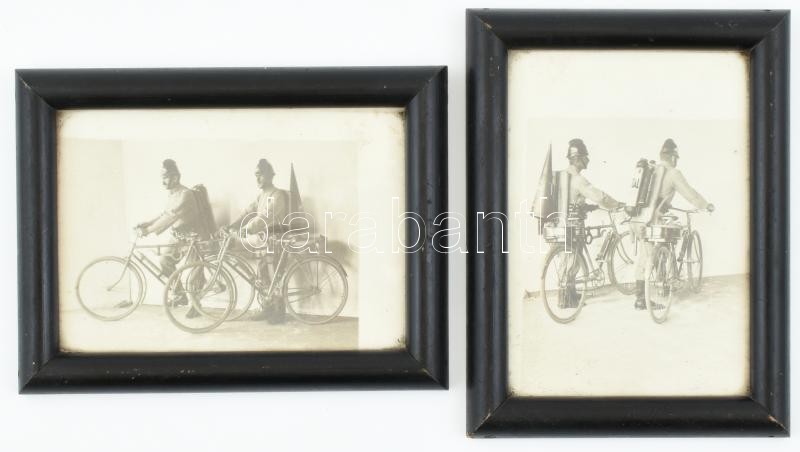 Beschreibung: cca 1930 2 db tűzoltó biciklin, fotó, üvegezett keretben, 11x16 cm, 16x11 cm