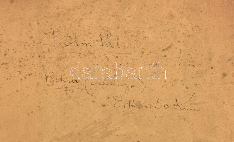 Böhm Pál (1839-1905): Betyár. Ceruza, papír. Jelzett. Hátoldalán régi felirattal, mely szerint Kézdi-Kovács László (1864-1942) gyűjteményét képezte. Proveniencia: Kézdi-Kovács Elemér (1898-1976), Kézdi Kovács László fia hagyatékából. Sérült keretben. 36,5x35 cm. / Pál Böhm (1839-1905): Outlaw. Pencil on paper. Signed. With old description on the reverse, according to it was part of the collection of painter László Kézdi-Kovács (1864-1942). Provenance: Estate of Elemér Kézdi-Kovács (1898-1976), son of László Kézdi Kovács. In damaged frame. 36,5x35 cm
