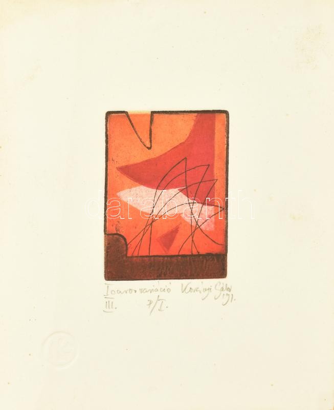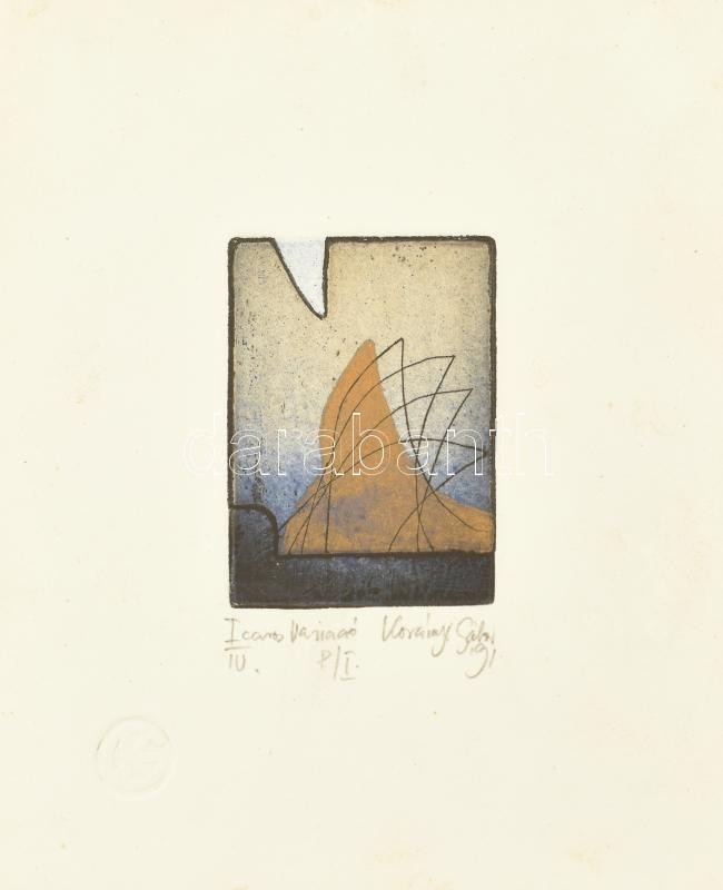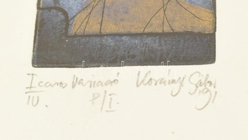Korányi Gábor (1952-), 4 db mű egy keretben: Icaros (Ikaros) variáció I-IV., 1991. Színes rézkarc, merített papír, jelzett. Mindegyik próbanyomat P./I jelzéssel. Üvegezett fa keretben. Kartonra kasírozva. Lapokon apró foltokkal. Korányi Gábor grafikái ritkán tűnnek fel a műkereskedelemben, mivel a 90-es évek óta Kaliforniában él. 4x8,5x6 cm
