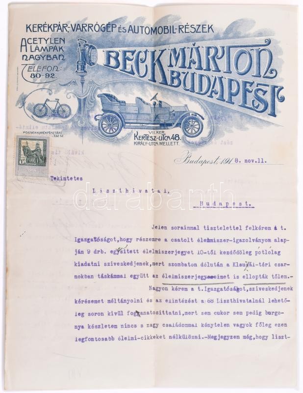 1918 Bp., Beck Márton kerékpár-, varrógép és automobil részek fejléces... https://www.darabanth.com/de/35-Gross-Auktion/35.1/Kunst-Dokumente-andere-Sammelgebiete/Dokument~14813/1918-Bp-Beck-Marton-kerekpar-varrogep-es-automobil-reszek-fejleces-szamlaja-okmanybe~II2365644