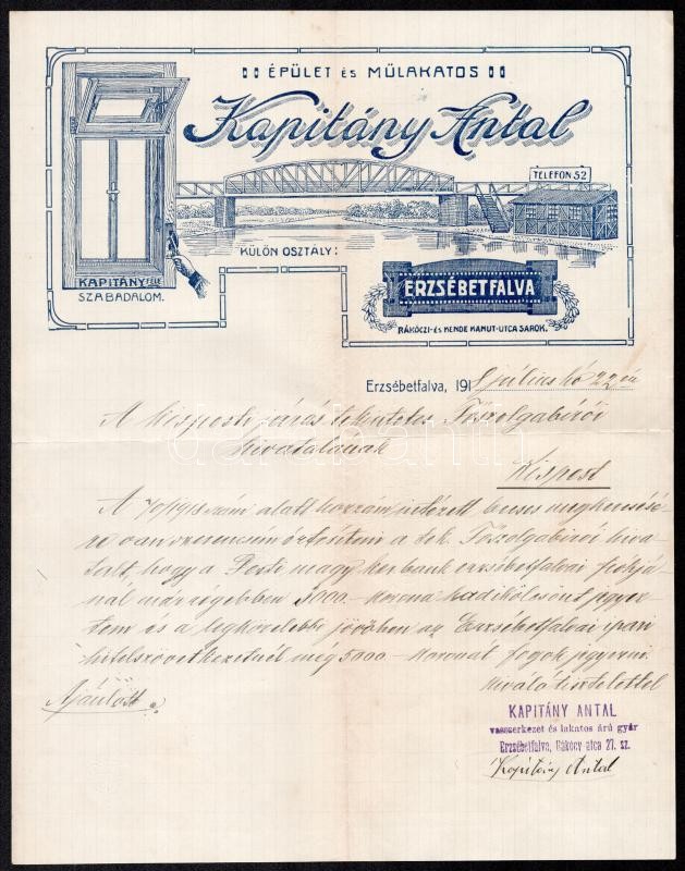 1918 Erzsébetfalva, Kapitány Antal épület és műlakatos fejléces levélp... https://www.darabanth.com/de/35-Gross-Auktion/35.1/Kunst-Dokumente-andere-Sammelgebiete/Dokument~14813/1918-Erzsebetfalva-Kapitany-Antal-epulet-es-mulakatos-fejleces-levelpapirjara-irt-level~II2365829