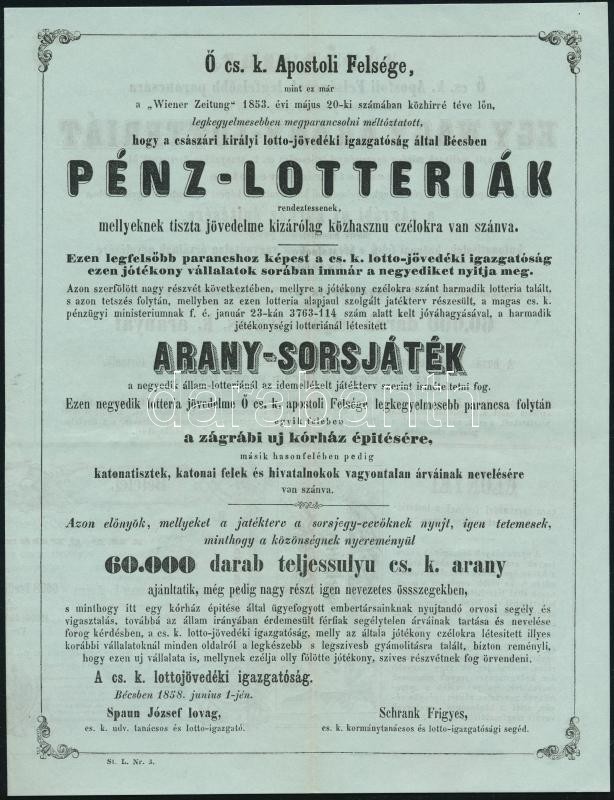 Beschreibung: 1853 Tájékoztatás az Ő. cs. k. Apostoli Felsége által elrendelt intézkedésről, miszerint a lottó jövedékét jótékony célra kell felhasználni