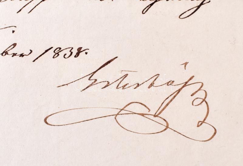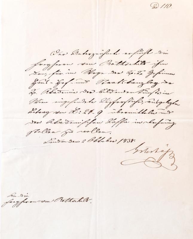 1838 Herceg galántai Esterházy Pál Antal (1786-1866) diplomata, később a király személye körüli miniszter, autográf aláírással ellátott londoni keltezésű levele, a Rotschild családnak, melyben kéri őket, hogy a számukra megküldött rézmetszetekért fizessenek a Bécsi Művészeti Akadémiának. Az Akadémián tanult ekkor és később is számos híres magyar képzőművész pl Freneczy István, Rudolf Alt, Munkácsy Mihály. Egy beírt oldal, hozzá a leirattal / 1838 Autograph signed letter of prince Paul von Esterhazy diplomat. The letter is for the Rotschilds in which he request them to pay for the engravings for the Vienna Academy of Arts.