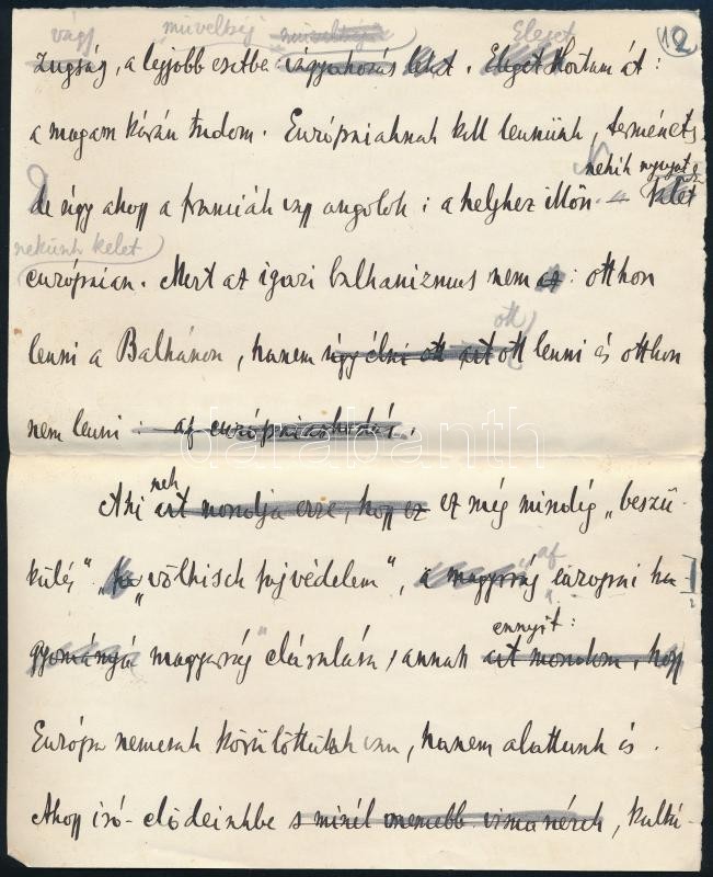 1943 Németh László (1901-1975) író, autográf kézirat-részlete. A dolgozatban az Európaiság magyar értelmezését fejtegeti, mely "igazibb mint amivel a pesti, ál-európaiak kínálgatnak. Sőt amivel ez a vérbe horgadt szemű Európa kínálni tud." két, tintával beírt oldalon. saját kezű ceruzás javításokkal.