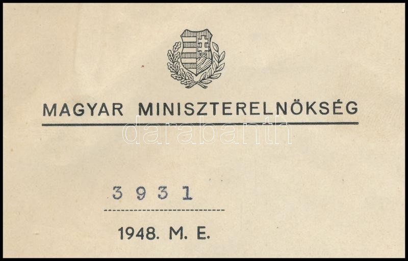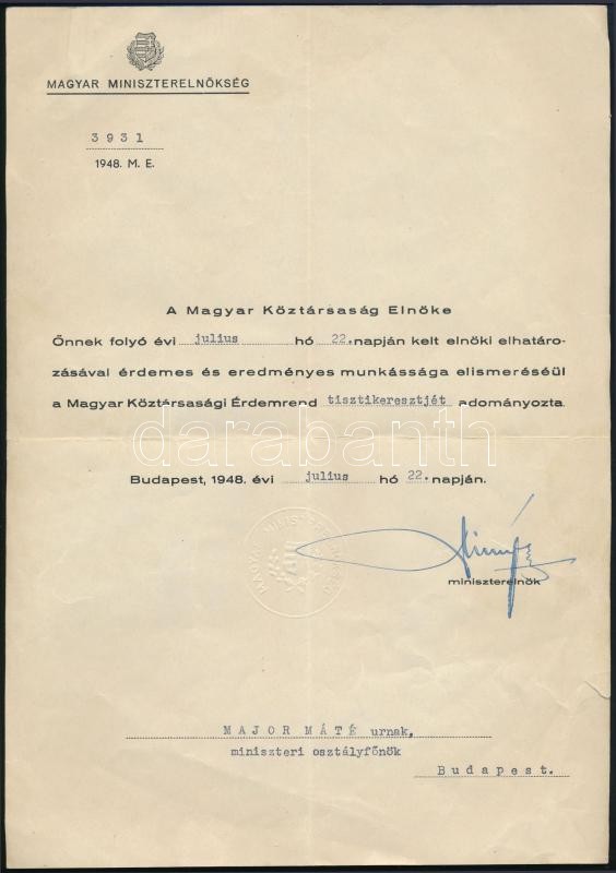 1948 Dinnyés Lajos miniszterelnök aláírt Magyar Köztársasági Érdemrend... https://www.darabanth.com/de/35-Gross-Auktion/35.1/Kunst-Dokumente-andere-Sammelgebiete/Historische-Dokumenten-Handschriften~15108/1948-Dinnyes-Lajos-miniszterelnok-alairt-Magyar-Koztarsasagi-Erdemrend-adomanyozo-oklevele~II2356926