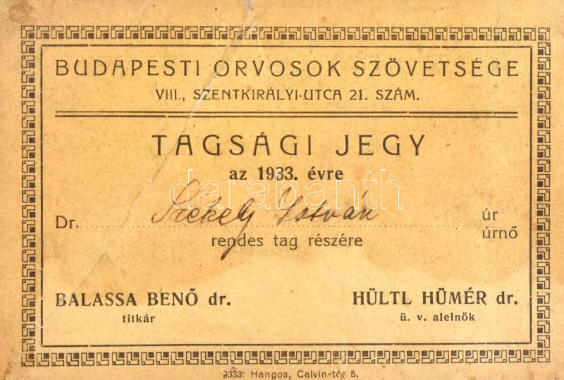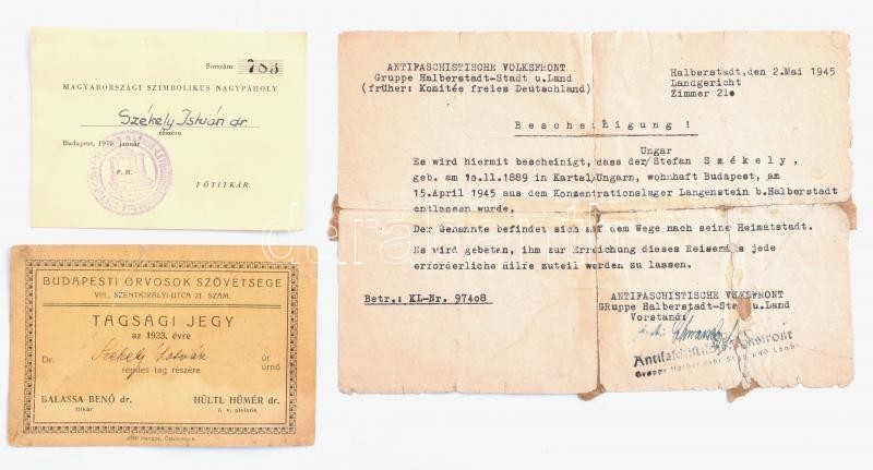 1933-1950 Dr. Székely István egykori koncentrációs táborba zárt orvos 3 db dokumentuma: a Budapesti Orvosok Szövetsége tagsági jegye, a Halberstadt melletti langensteini koncentrációs táborból való elbocsátó levele (KL-Nr. 97408), pecsételve, aláírva és a Magyarországi Szimbolikus Nagypáholy tagsági kártyája