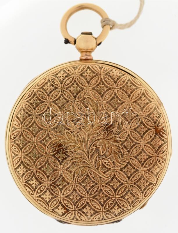 XIX. sz. második fele: 14 K arany női kulcsos zsebóra. Gazdagon díszített, jelzett tokkal. 9 köves szerkezettel, szép, működő állapotban, szép számlappal, felhúzó kulccsal d: 34 mm, dr 22,18 g / 19 th century 14 C gold women's pocket watch with winding key. Nice condition, works well, d: 34 mm, gross 22,18 g