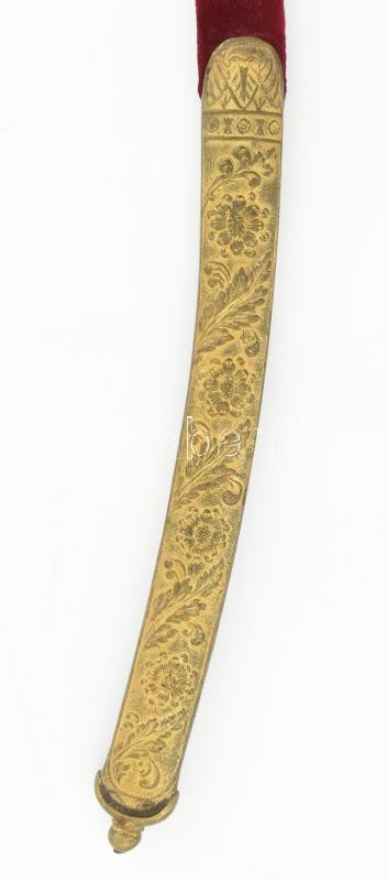 Díszmagyar kard. XIX. sz. Figurális, Szent István királyt ábrázoló markolattal, magyar címerrel, bársony borítású hüvellyel. 98 cm / Hungarian nobleman parade sword with figural grip and with Hungarian coat of arms. With velvet covered scabbard 98 cm