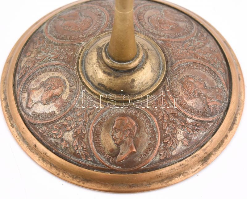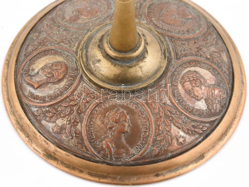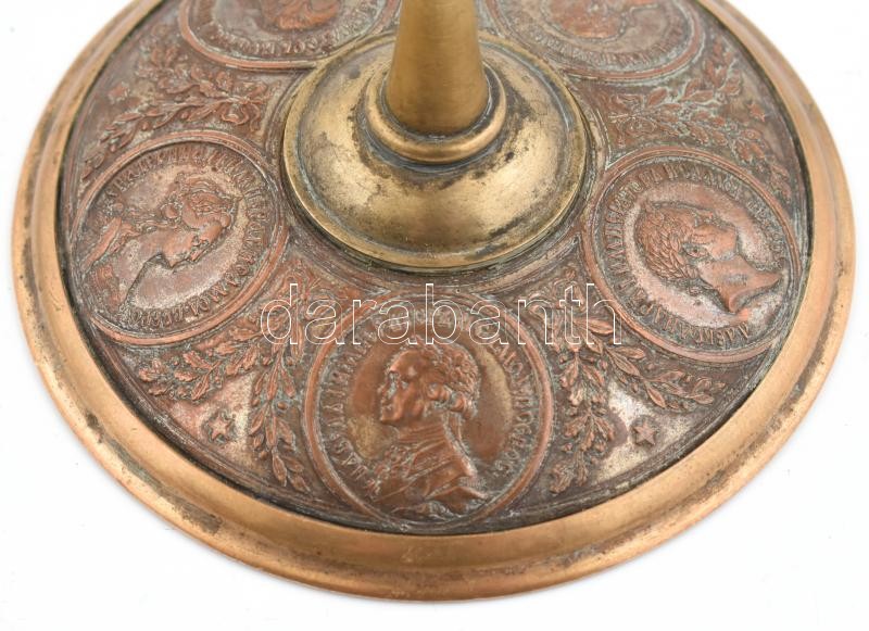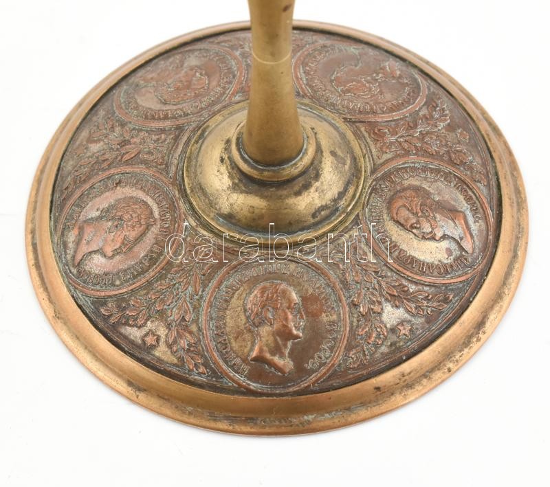 Orosz, cári emlék serleg Fjodor Tolsztoj (1783-1873) festő, éremművész által készített medalionokkal. XIX. sz. A kelyhen található három nagyobb medalion . Az orosz birodalmi kiscímer;. I. Sándor cár, mint Radomysl szláv isten;. Az elizavetpoli csata, 1826. A Sándor cárt ábrázoló az 1812-es honvédő háború (Napóleon oroszországi hadjárata) emlékére készített 24 medallionból álló sorozat első darabja. Az 1826-os elizavetpoli (ma Ganja Azerbajdzsán) csata az 1826-1828-as orosz-perzsa háború egyik ütközete. A serleg talpán öt uralkodóportré: II. Katalin cárnő, I. Pál, I. Sándor, I. Miklós és II. Sándor cár. valószínűleg ezek is Tolsztoj munkái. Alekszandr Pavlovics Ljalin éremművész jelzésével. Bronz, réz. m:20,5 cm / 19th century Russian chalice with medalions depicting Russian Tzars Alexander I, Nicholas I, Alexander II. Catherine II. and the battle of Elisavetpol (today Ganja, Azerbaijan) and Alexander I as Radomysl Slavic god. Works of Fjodor Tolstoy and Aleksandr Pavlovitch Ljalin. Porrer, bronze. 20,5 cm