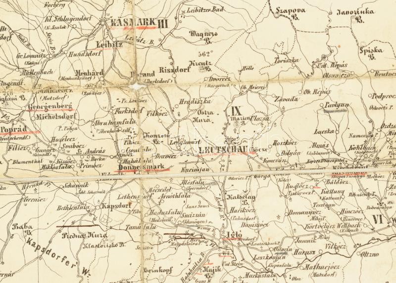 Beschreibung: cca 1857-1859 Zipser Comitat (Szepes vármegye) térképe, vászontérkép, ceruzás aláhúzásokkal, 46×38 cm