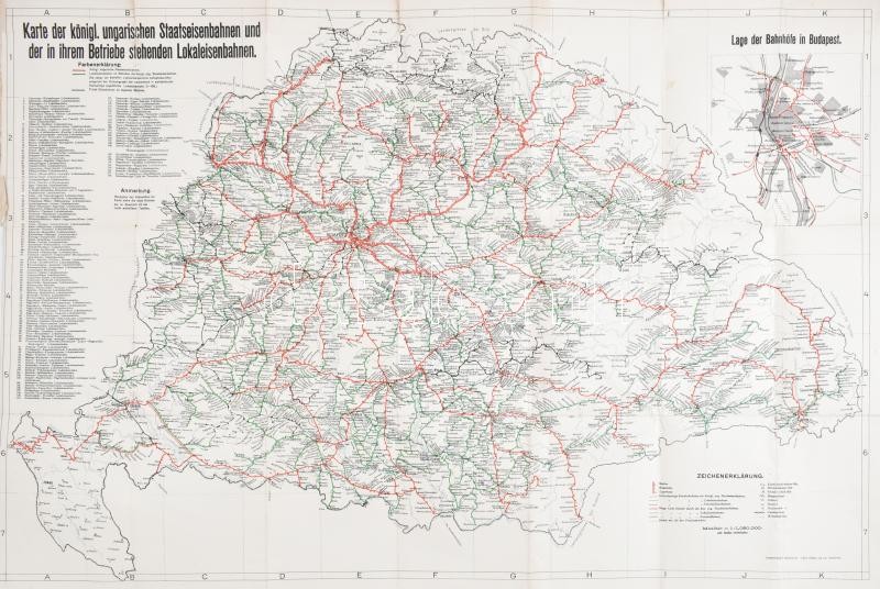cca 1910 Karte der königl. ungarischen Staatseisenbahnen und der in ihrem Betriebe steheden Lokaleisenbahnen, 1:1,050.000, német nyelven, Bp., Klösz György és Fia-ny., szakadt, 63x93 cm