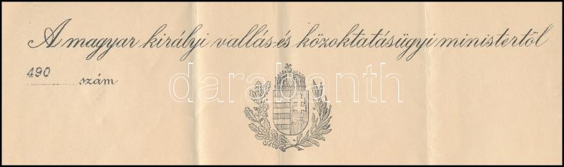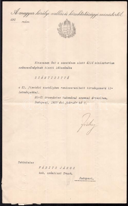1912 Zichy János (1868-1944) második Khuen-Héderváry-kormány vallás- és közoktatásügy miniszterének (1910-1912) saját kezű aláírása egy számtiszti kinevezésen, fejléces papíron, szárazpecséttel, 1912. feb. 5.
