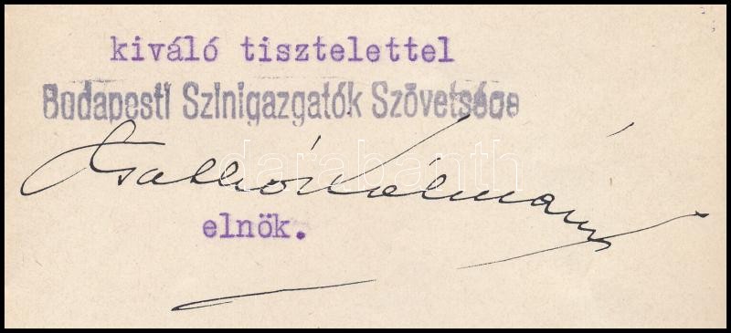 1941 Csathó Kálmán (1881-1964) író, rendező, a Budapesti Színigazgatók Szövetségének elnökének gépelt kondoleáló levele Verő György Margó Célia (1864-1943) operett énekesnő részére, férje Verő György (1857-1941) zeneszerző, színműíró, rendező halála miatt, a Budapesti Színigazgatók Szövetségének fejléces papírján.