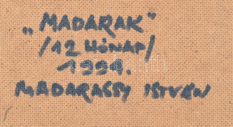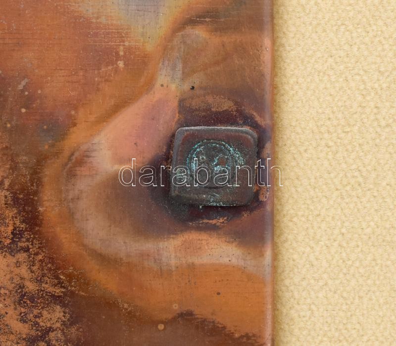 Madarassy István (1948):: Madarak (12 hónap), 1994. Vörösréz hegesztett lemez, textillel bevont faroston, jelzett. A hátoldalán autográf felirattal és a művész névjegykártyájával. Ca. 41×32 cm. Fa keretben. Kiállítva: Házat-Hazát Alapítvány Jótékonysági kiállítás és vásár, 1997. Reprodukálva: Házat-Hazát Alapítvány Jótékonysági kiállítás és vásár, 1997, katalógus 21. o Jótékonysági árverés a Házat-Hazát Alapítvány otthonteremtési programjának támogatására. / Copper, signed, with autograph description and the artist's business card on the reverse. Exhibited: Házat-Hazát Foundation, charity exhibition and sale, Gödöllő, Hungary, 1997. Reproduced: Házat-Hazát Foundation, charity exhibition and sale, Gödöllő, Hungary, 1997, catalogue, page 21.