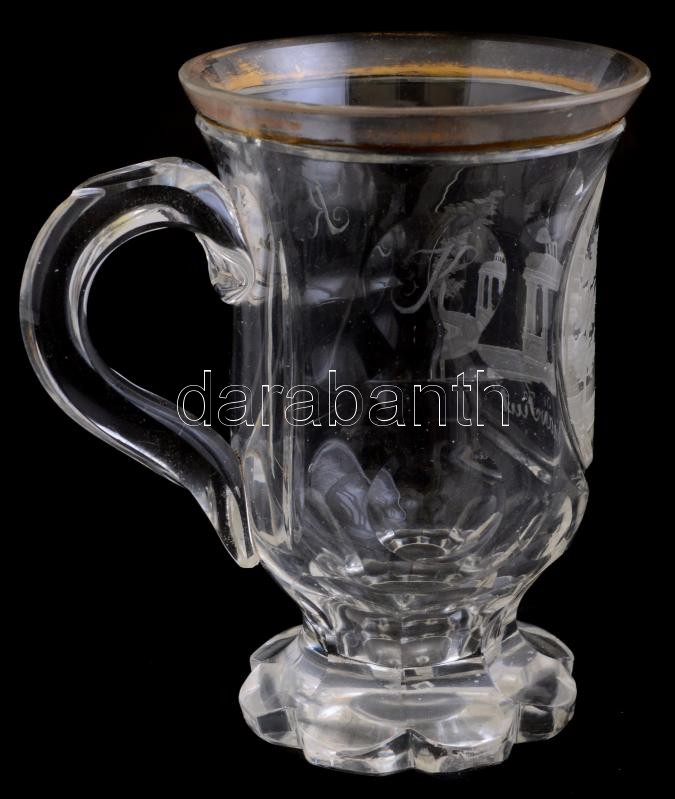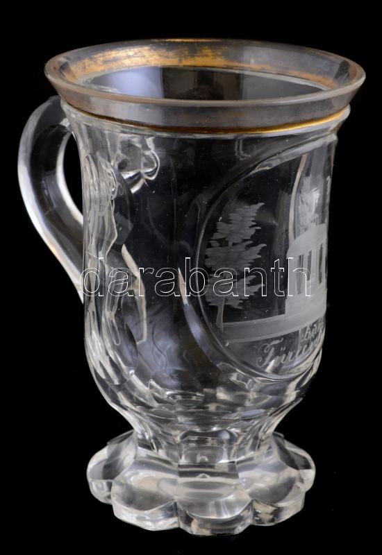 Balatonfüredi emlék pohár a füredi kút képével. XIX. sz. vége. Kézzel festett, metszett, formába öntött üveg pohár. Kopásokkal 11 cm / Balatonfüred commemoratíve glass.