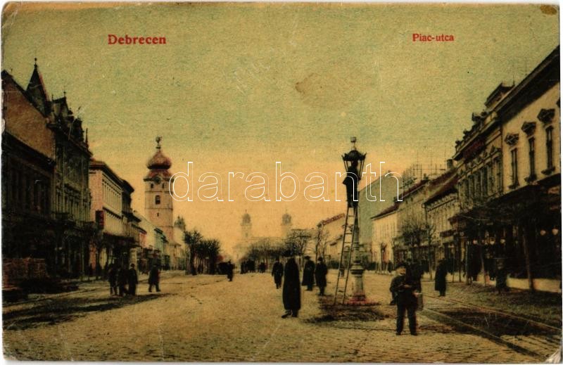 Beschreibung: 1909 Debrecen, Piac utca, Református kistemplom (még ép kupolás toronnyal), létrán egy ember égőt cserél a villanyoszlopban (EK)