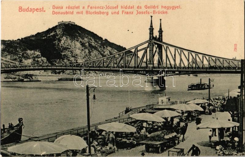 Beschreibung: Budapest, Duna, Ferenc József híd, pesti rakpart piac, Citadella és Gellérthegy. Taussig A.