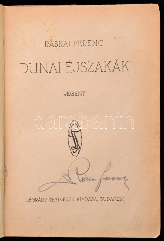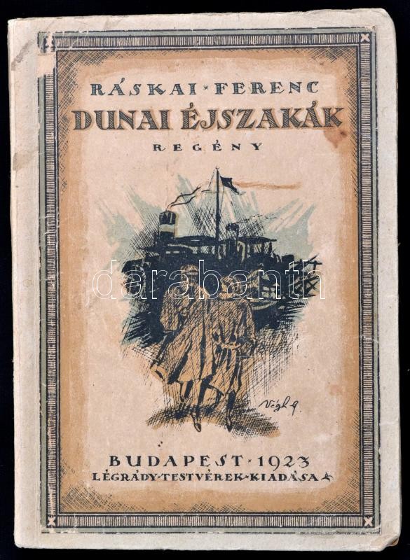 Ráskai Ferenc: Dunai éjszakák. A borító rajza Végh Gusztáv munkája. Bp., 1923, Légrády, 203 p. Átkötött papírkötésben, az eredeti elülső papírborítót az átkötéskor az elülső borítóra kasírozták. A szerző által aláírt. Ritka! Ráskai Ferenc (1883-1942) zsidó származási író, újságíró, színpadi író. 1903-1936 között a Pesti Hírlap munkatársa, majd színházi rovatvezetője. Számos színmű és regény szerzője.