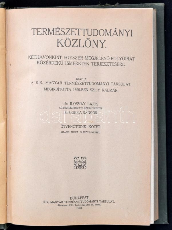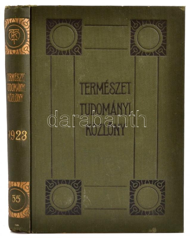 1923 Természettudományi Közlöny. Szerk.: Dr. Gorka Sándor. LV. kötet. 799 (helyesen 803)-806.,808. füzetek. Nem teljes évfolyam, a 807. füzet, 1923 szept.-okt. hiányzik.+Pótfüzetek a Természettudományi Közlönyhöz. Szerk.: Gorka Sándor. CXLI-CXLIV. pórfüzet. 1921. évi LIII. pótfüzethez. Bp.,1923-1921, Kir. M. Természettudományi Társulat. VIII+1-256+321-384+80 p. Korabeli aranyozott festett egészvászon-kötés, a borÃtón kisebb kopásnyomokkal, gerinc alján apró sérüléssel, de alapvetÅ‘en jó állapotban.
