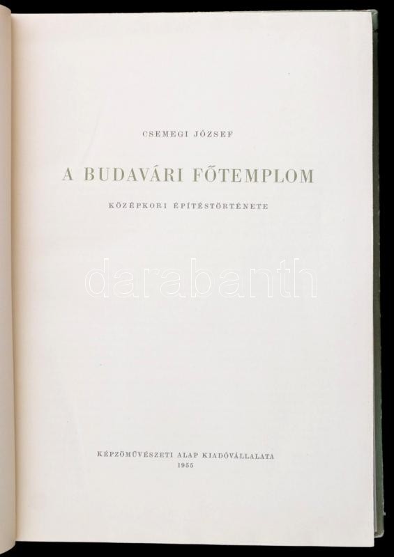 Csemegi József: A budavári fÅ‘templom középkori épÃtéstörténete. Magyar Műemlékek. Bp., 1955, KépzÅ‘művészeti Alap Kiadóvállalata. Fekete-fehér fotókkal, ábrákkal illusztrálva. Német nyelvű rezümével. Kiadói félvászon kötés, kopottas borÃtóval.