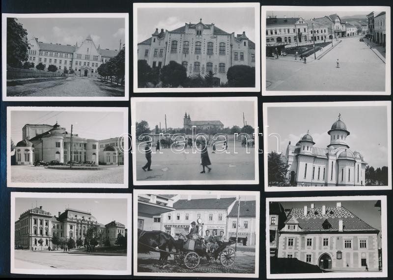 Beschreibung: cca 1940 Erdélyi városképek (Tusnád, Borszék, Kolozsvár, Nagyvárad, Gyergyószentmiklós, stb.), 42 db hátoldalon feliratozott fotó, 6×8 cm