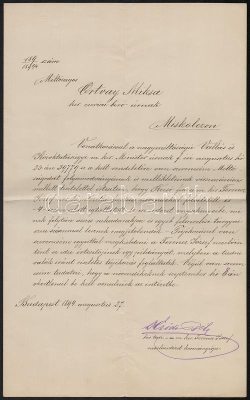 1894 Bp., Ortvay Miksa kir. kúriai bírónak címzett levél https://www.darabanth.com/de/350-Fernauktion/350.0/Kunst-Dokumente-andere-Sammelgebiete/Dokument~17/1894-Bp-Ortvay-Miksa-kir-kuriai-bironak-cimzett-level~II1990140