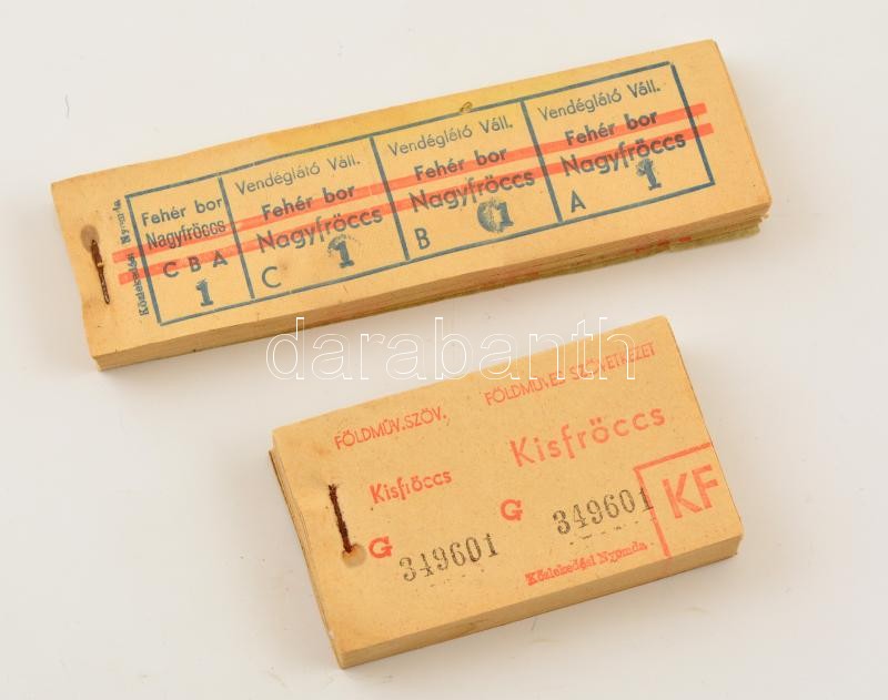 Beschreibung: cca 1975 Földműves Szövetkezet kisfröccs tömb, 100 db, sorszámozott + Vendéglátó Vállalat nagyfröccs tömb, 100 db, sorszámozott