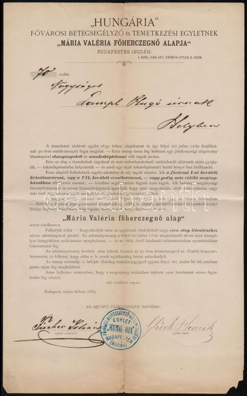 1885 Meghívó a Hungária Fővárosi Betegsegélyező és Temetkezési Egylet fennállásának 50 éves emlékünnepélyére, magyar és német nyelven, pecséttel, aláírásokkal, 34x21 cm