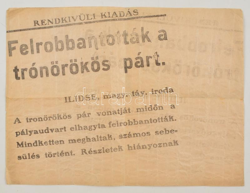 1914 Felrobbantották a trónörökös párt, röplap. Benne a trónörökös pár vonta elleni bombamerénylet hírével, valamint a halálhírükkel, Ilidse (Ilidža.) (Tévesen. Nem a vonat elleni bombamerényletben haltak meg.) Hajtásnyomokkal, 19x26 cm.