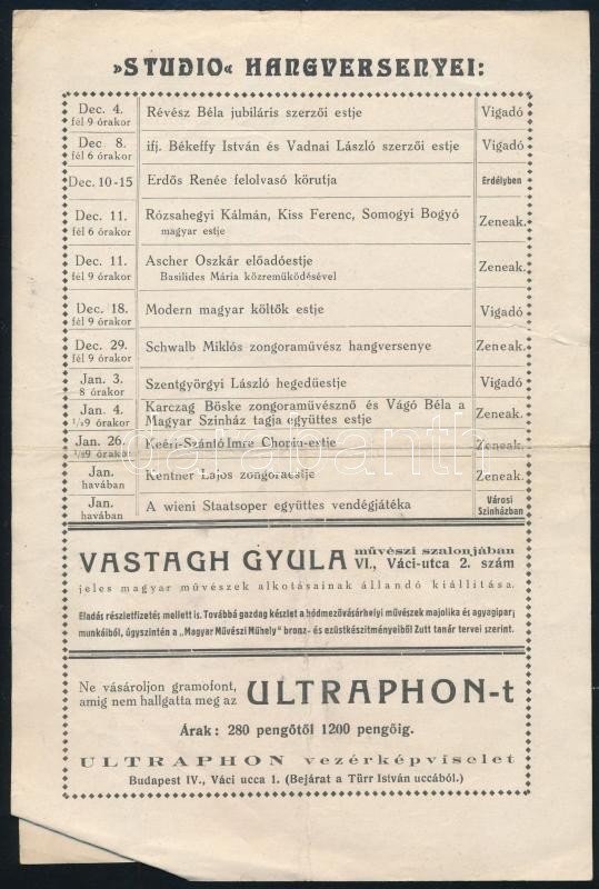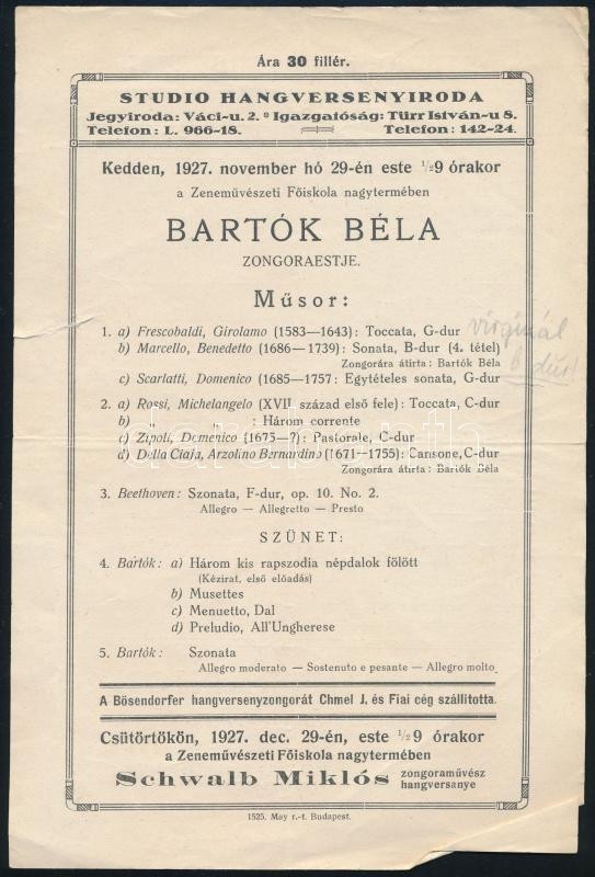 1927 Bartók Béla zeneszerző zongoraestjének műsora, a Zeneművészeti Fő... https://www.darabanth.com/de/350-Fernauktion/350.0/Kunst-Dokumente-andere-Sammelgebiete/Drucksachen~31/1927-Bartok-Bela-zeneszerzo-zongoraestjenek-musora-a-Zenemuveszeti-Foiskola-nagytermeben~II1991225