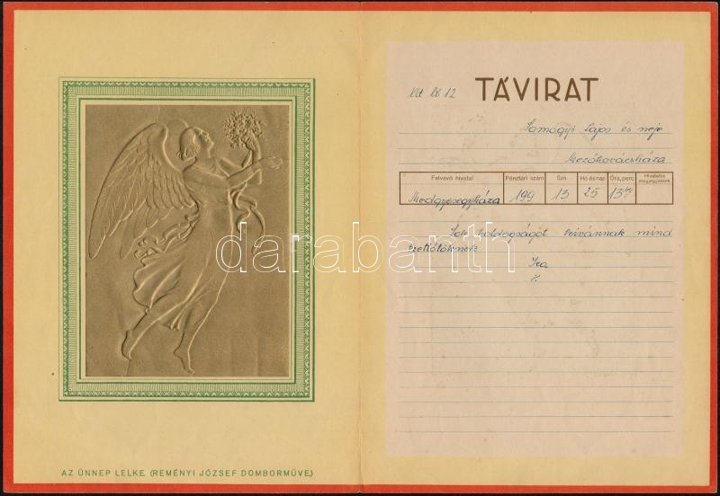 Beschreibung: cca 1930 Magyar Királyi Posta díszes távirat, Reményi József domborművéről készült dombornyomott képpel, 25x18,5 cm