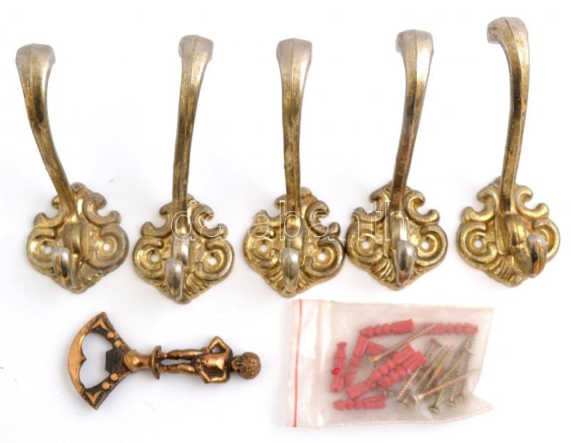 Beschreibung: Réz tárgyak: 5 db akasztó és egy réz sörnyitó, csavarok