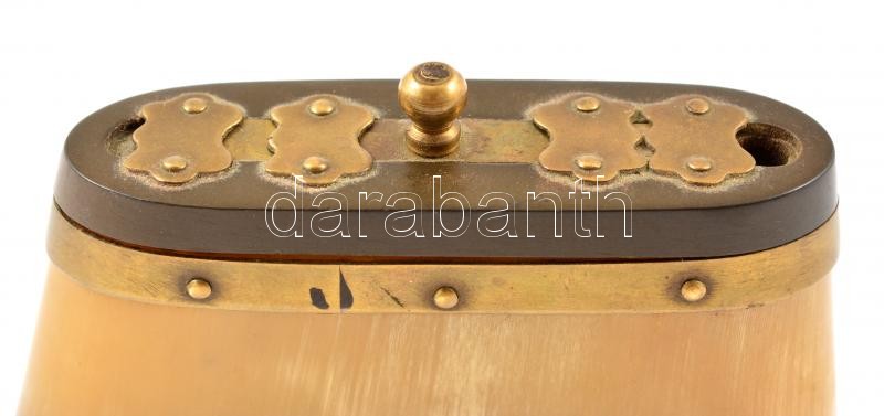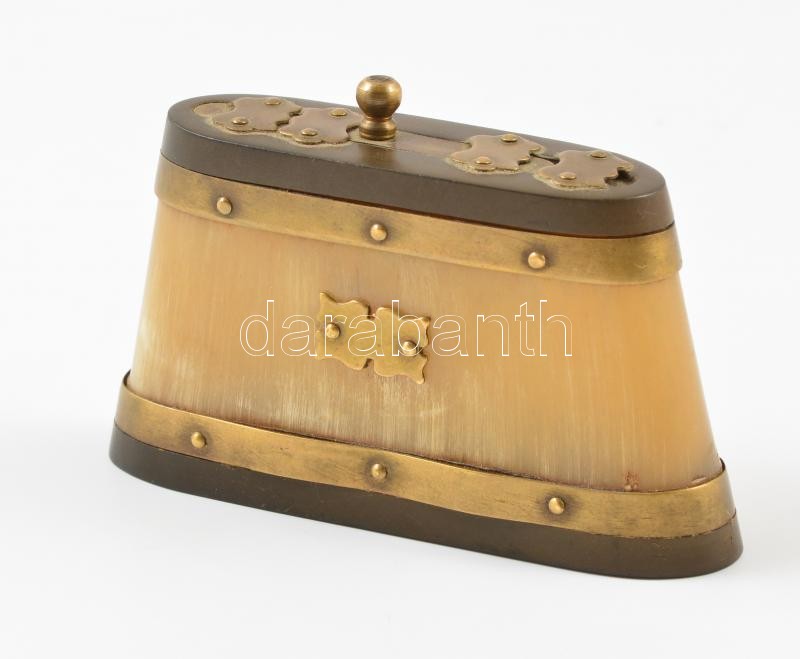 cca 1900 dohánytartó, réz-szaru-bakelit, jelzés nélkül, 9×5 cm https://www.darabanth.com/de/350-Fernauktion/350.0/Kunst-Dokumente-andere-Sammelgebiete/Flohmarkt~11/cca-1900-dohanytarto-rez-szaru-bakelit-jelzes-nelkul-9C3975-cm~II1961750