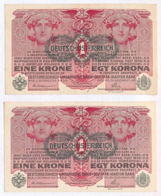 1916. 1K (2x) sorszámkövetők, mindkettő "DEUTSCHÖSTERREICH" ... https://www.darabanth.com/de/350-Fernauktion/350.0/Numismatik/Ungarische-Banknoten~1000007/1916-1K-2x-sorszamkovetok-mindketto-DEUTSCHOSTERREICH-felulbelyegzessel-TI-~II1992581