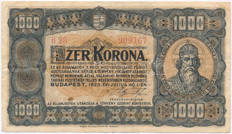 Beschreibung: 1923. 1000K "Magyar Pénzjegynyomda R.t. Budapest" nyomdahely jelöléssel T:III