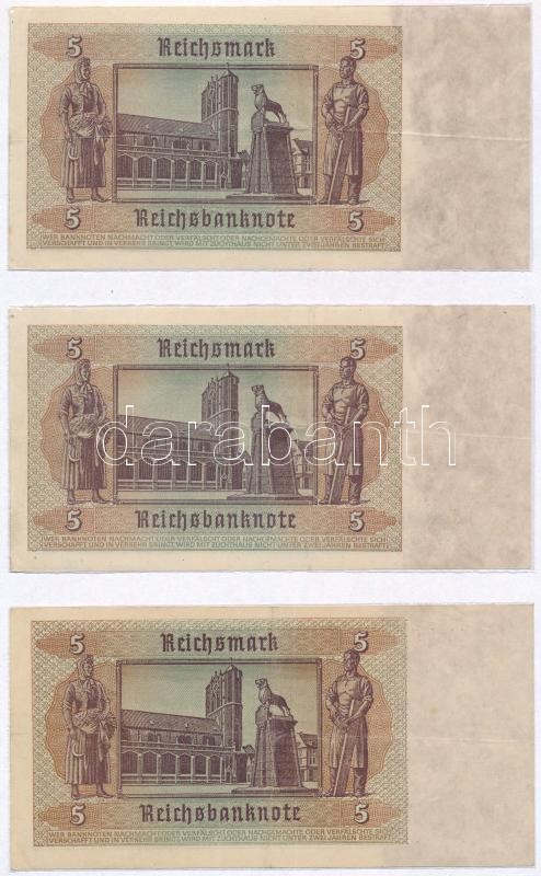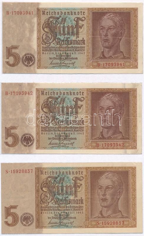 Német Harmadik Birodalom 1942. 5M (3x) közte 2db sorszámkövető, mindhárom lezárt fóliában T:III